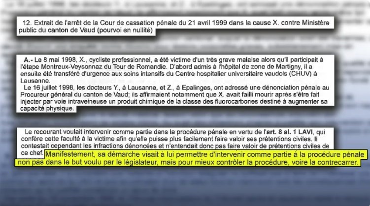 En juillet 1998, alors qu'en France l'affaire Festina vient d'éclater, deux médecins du CHU de Lausanne décident de porter plainte contre X. Ils n'ont pas soigné directement Mauro Gianetti, ils ne sont donc pas tenus par le secret médical. Dans la foulée, la justice suisse ouvre une enquête pour “lésions corporelles graves” et “mise en danger de la vie d'autrui”. Le juge d'instruction saisit le dossier médical et les prélèvements sanguins effectués sur Mauro Gianetti. Le médecin cantonal, qui fait office d'autorité de santé en Suisse, autorise la levée du secret médical pour que tous ces éléments puissent être exploités par la justice. “Cette personne avait fait un malaise systémique grave. Ce n'était pas une chute ou une cheville foulée ! Cela nous interpellait”, se souvient le médecin cantonal Jean Martin, aujourd'hui à la retraite. “Il fallait que la justice puisse procéder à des investigations complémentaires”.