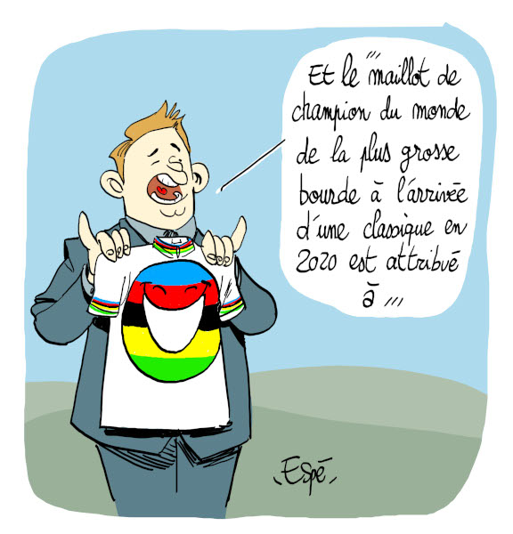 Personne n'a relevé ces trois Slovènes, d'autant que le scénario de l'arrivée a masqué ce trio, avec le ridicule que l'on sait des bras levés trop tôt du Français, après s'être écarté de sa ligne, puis déclassé à la 5ème place. Encore une énorme erreur de cadet qui se sentirait trop surpuissant, survolté. Certains adolescents qui inhalent du protoxyde d'azote, le gaz d'un siphon à chantilly, ne font pas mieux.